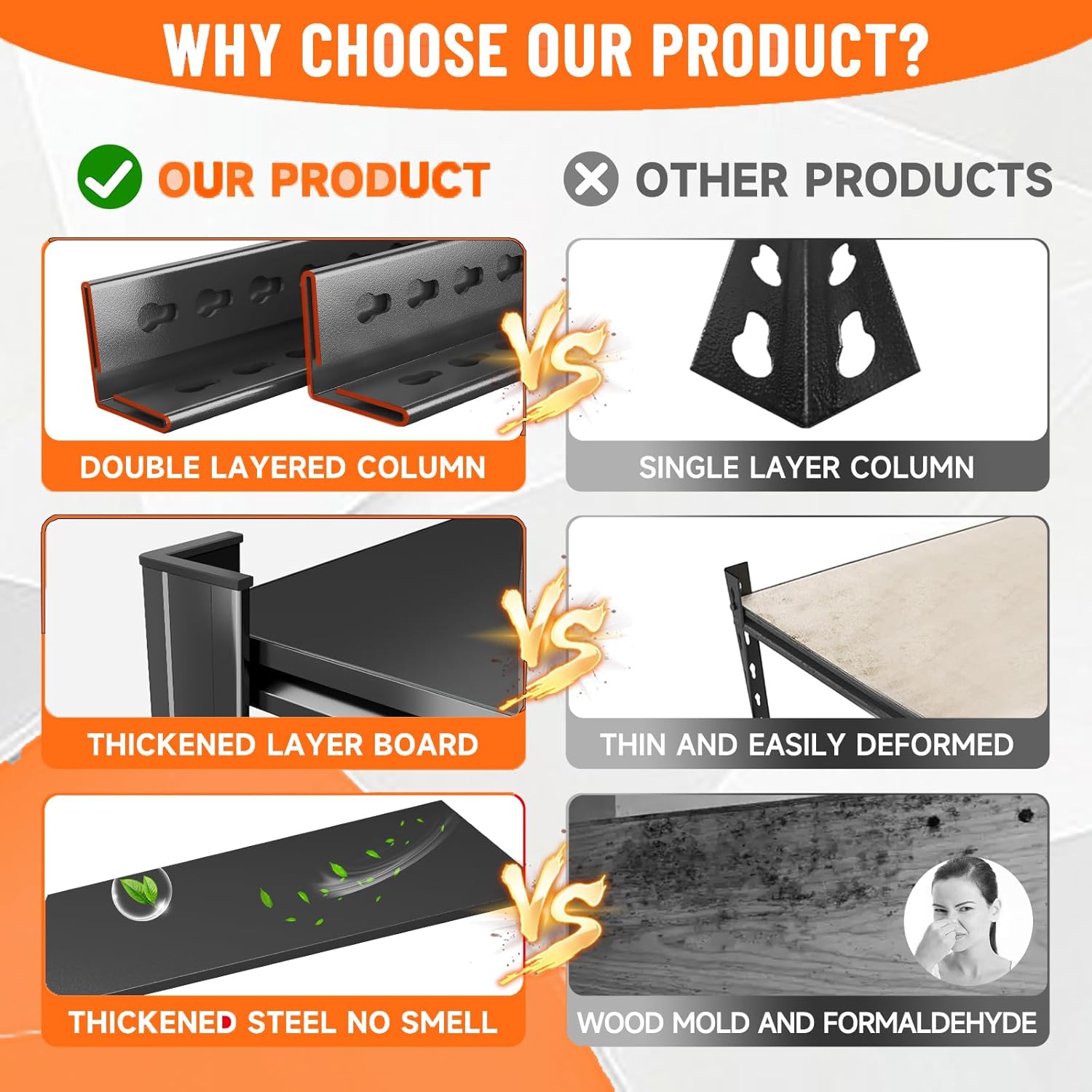 - 【3500LBS Metal Storage shelves】This metal garage shelving is made of high-quality thickened cold-rolled steel, with a hardness increase of 30% compared to ordinary steel. The double-layer column design greatly improves the stability and load-bearing capacity of the storage shelves, with a comprehensive load-bearing capacity of up to 3500LBS and a load-bearing capacity of 700LBS per layer