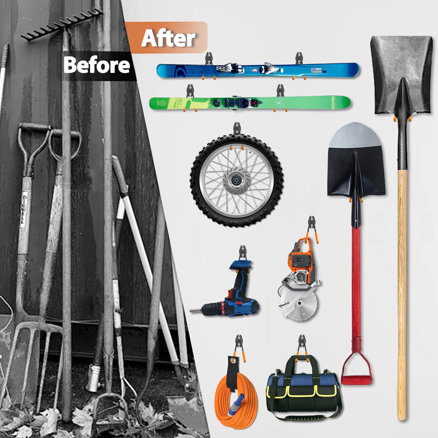 3-H Garage Wall Hooks 42 Pack, Heavy Duty Garage Hooks with Extra Welding Spots, Wall Mount Storage Organizer for Hanging Garden Lawn Tools, Ladder, Bike, WeedEater, Chair, Shovel, Blower (Orange)