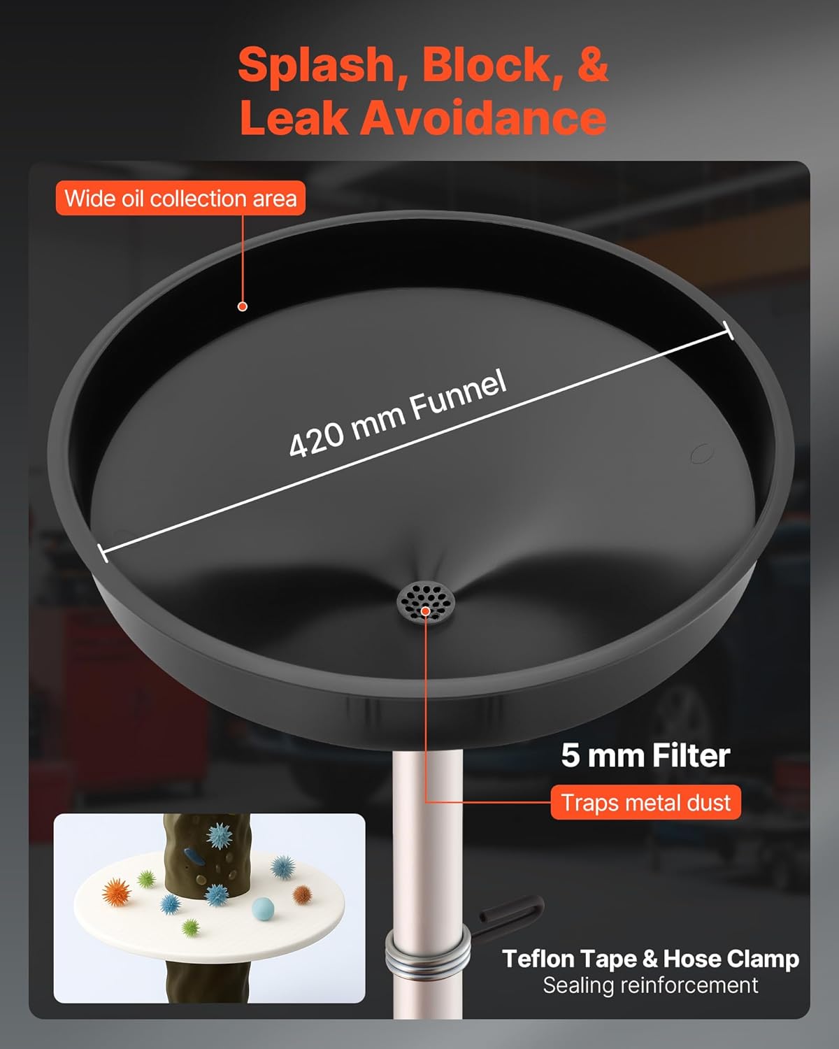 - Leak-proof Design: Our oil drain container includes a 16.5-inch wide spill-proof funnel, improving oil recovery. Comes with extra sealing tape and clamps for additional leak protection, avoiding overflow and spills