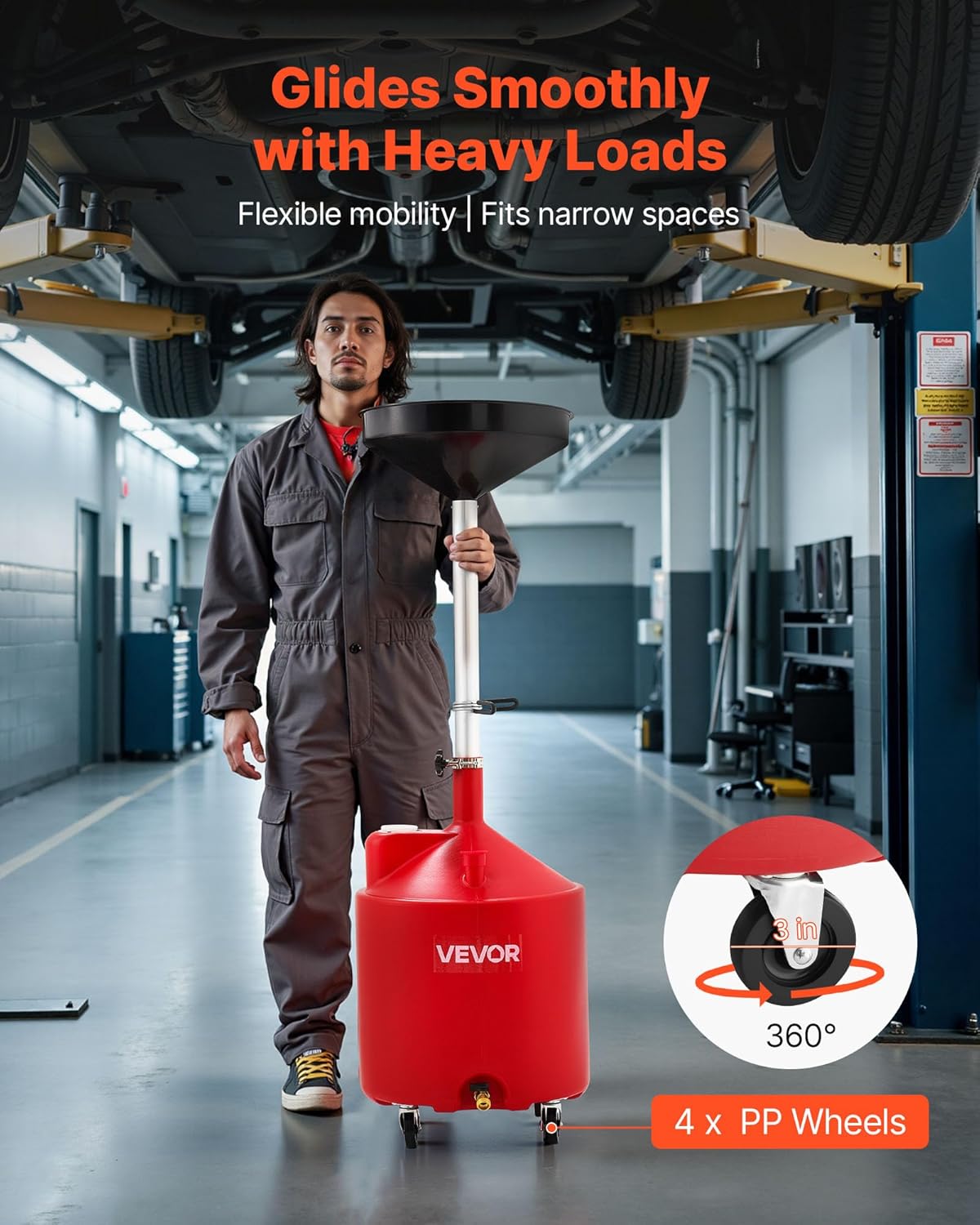 - Easy Mobility: Four-wheel drive with 3-inch swivel wheels of the portable oil drainer ensures smooth transport in complex environments like auto repair shops or personal garages
