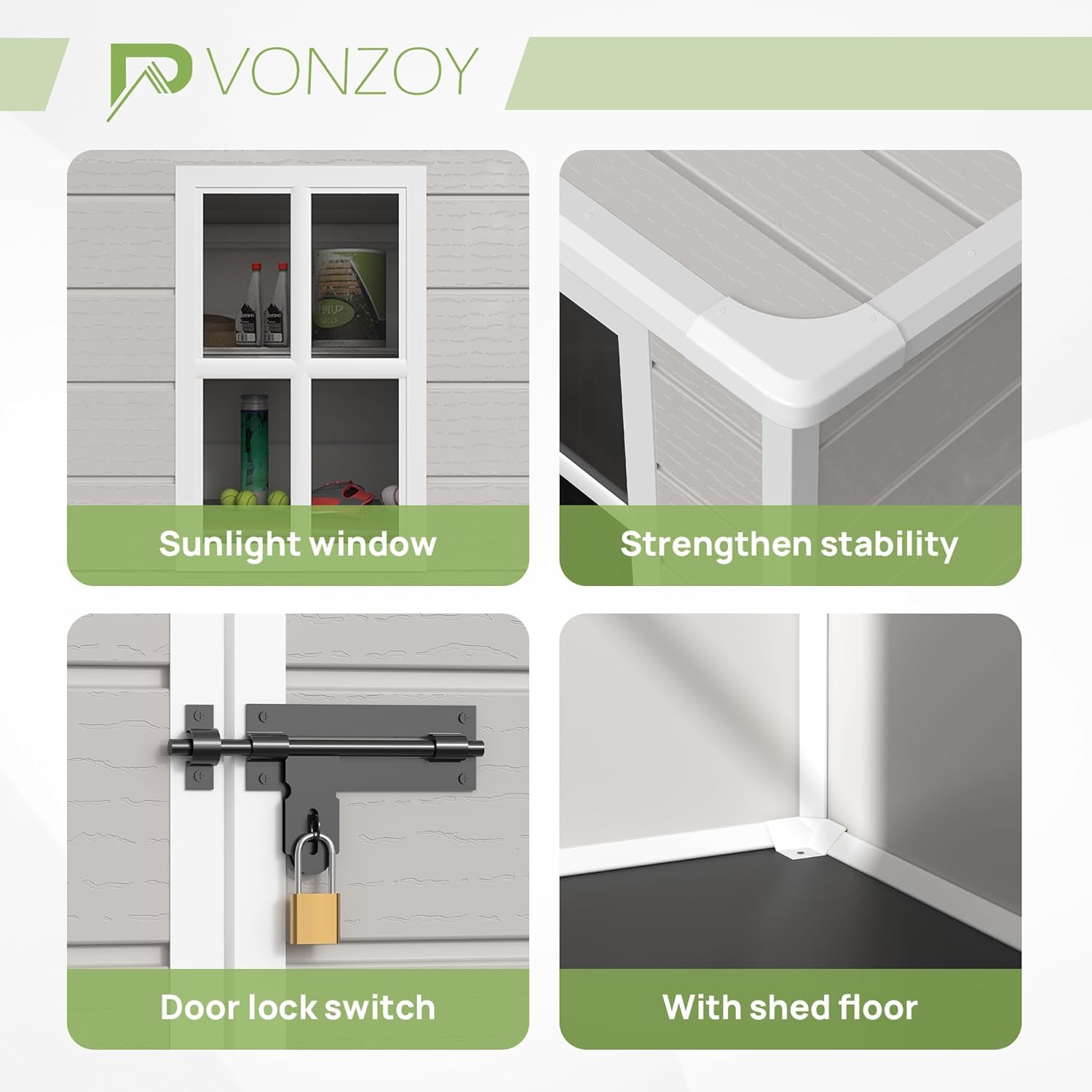 - Delivery Tip:VONZOY Resin Shed is available in many sizes for multipurpose use, perfect for outdoor backyard, garden, patio, utility room. The plastic shed can also be used as a pet house to provide a warm and safe room for your pet.Big size shed in 3 or more boxes, Please pay more attention to confirm information.