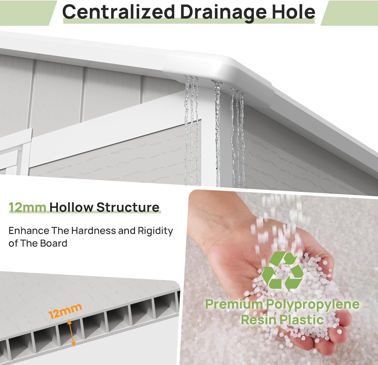 - Recyclable resin material: Compare iron and wooden, resin shed is corrosion-resistant, waterproof, rustproof and with UV protection for more than 8000 hours. Our storage shed is crafted with 13 MM hollow design polypropylene resin plastic of recyclable, less bending and puncturing, all weather conditions for customers.