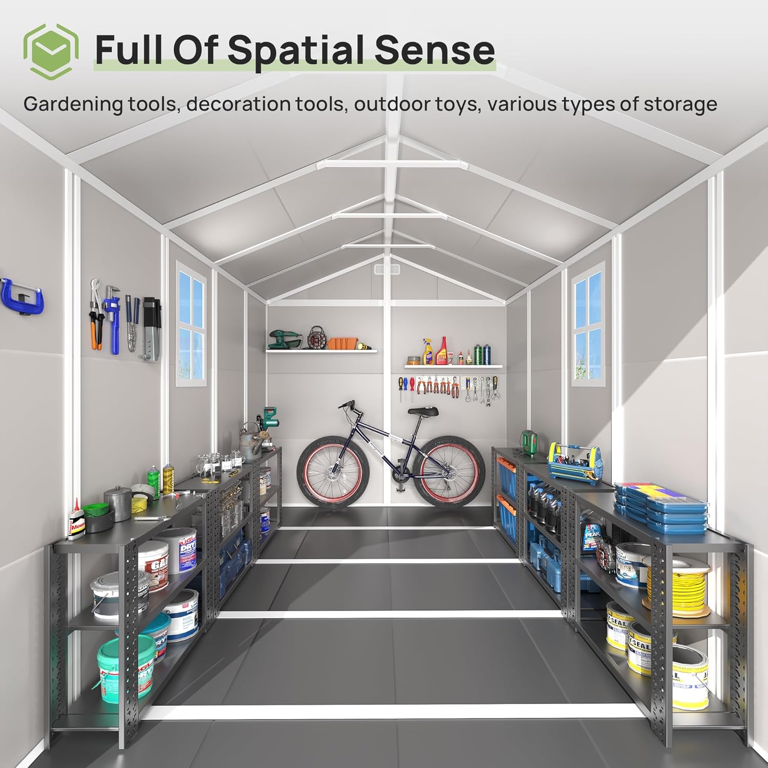- Double-wall stable design: Tough, double-wall resin construction with impact-resistant floor for long-term durability. The overlapping wall panels are water and moisture resistant for worry-free use in all weather conditions,Weather-resistant, waterproof and UV protected will not peel, rot or rust.(Max Wind resistant grade: 6 (24-30 mph); Maximum snow thickness tolerance: 7 inches)