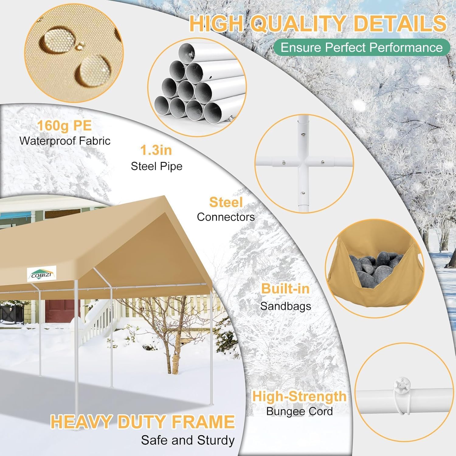 - 【Sturdy Structure】 Our heavy duty carport features 1.5-inch steel pipes with premium powder coating finish (more durable than galvanized), ensuring superior structural stability and enhanced rust/corrosion resistance. Equipped with large ground nails, wind ropes, and built-in sandbags for maximum stability.