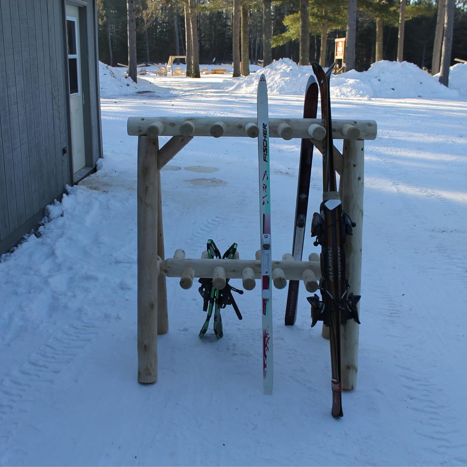 - 100% NORTHERN WHITE CEDAR CONSTRUCTION: Crafted from durable Northern White Cedar logs, this wood storage rack combines strength and rustic appeal. Use it unfinished to allow a silver-gray patina or stain it to match your existing garage storage setup. Whether it’s used as a ski rack for garage interiors or an outdoor snowboard storage rack, it offers a natural look and dependable performance season after season.