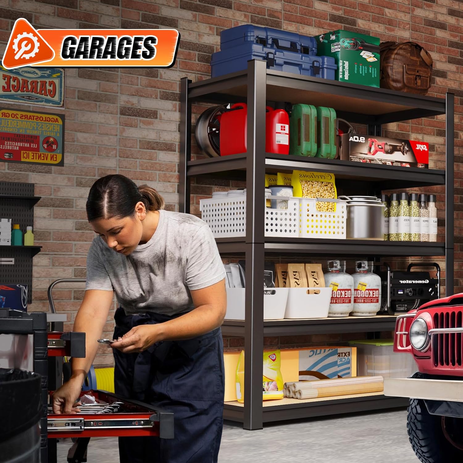 - 【Wider Crossbeams, Heavy-Duty Weight Capacity】This wooden garage shelf features wider crossbeams, paired with a high-strength steel frame and high-density wood panels, boasting a 500-pound per-shelf capacity. The wider crossbeams effectively distribute weight, and when combined with the sturdy steel structure, they easily hold heavy tools, bulk goods—making it ideal for garage shelving, warehouses, workshops, or as heavy duty garage shelving in industrial spaces. It’s a top choice for anyone looking to upgrade their garage shelving with reliable load-bearing performance, whether for home garages or professional setups.