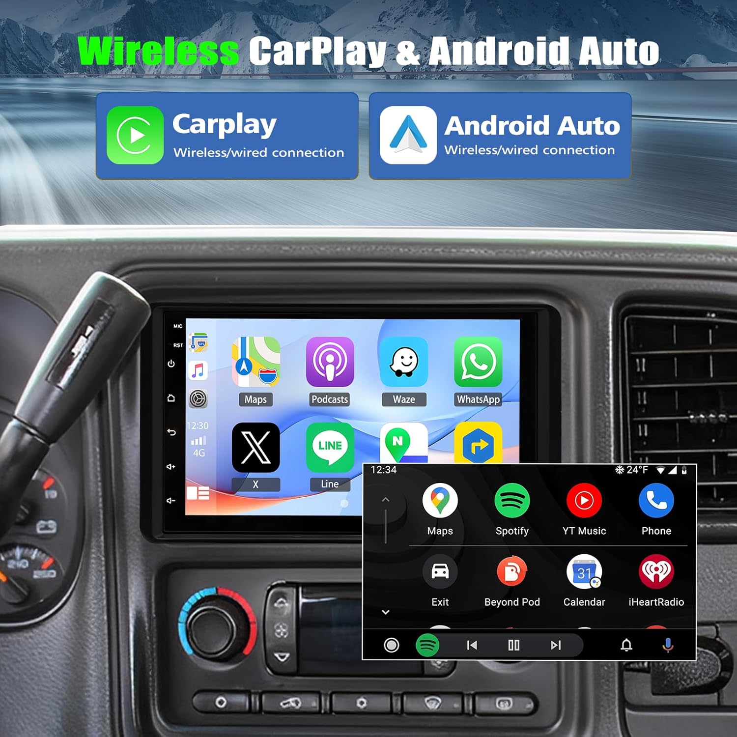 - 【Support CarPlay & Android Auto】This wireless carplay for 2003 silverado 1500 radio is compatible with CarPlay and Android Auto, you can connect your phone to CarPlay or Android auto by wired or wireless, it can easily access your phone contacts, emails, GPS navigation, music and so on, and integrate smart voice control via Siri and Google assistant, you can easily make calls, listen music, GPS navigation ect, keeps you stay focused, and brings you safer, more comfortable driving experience!