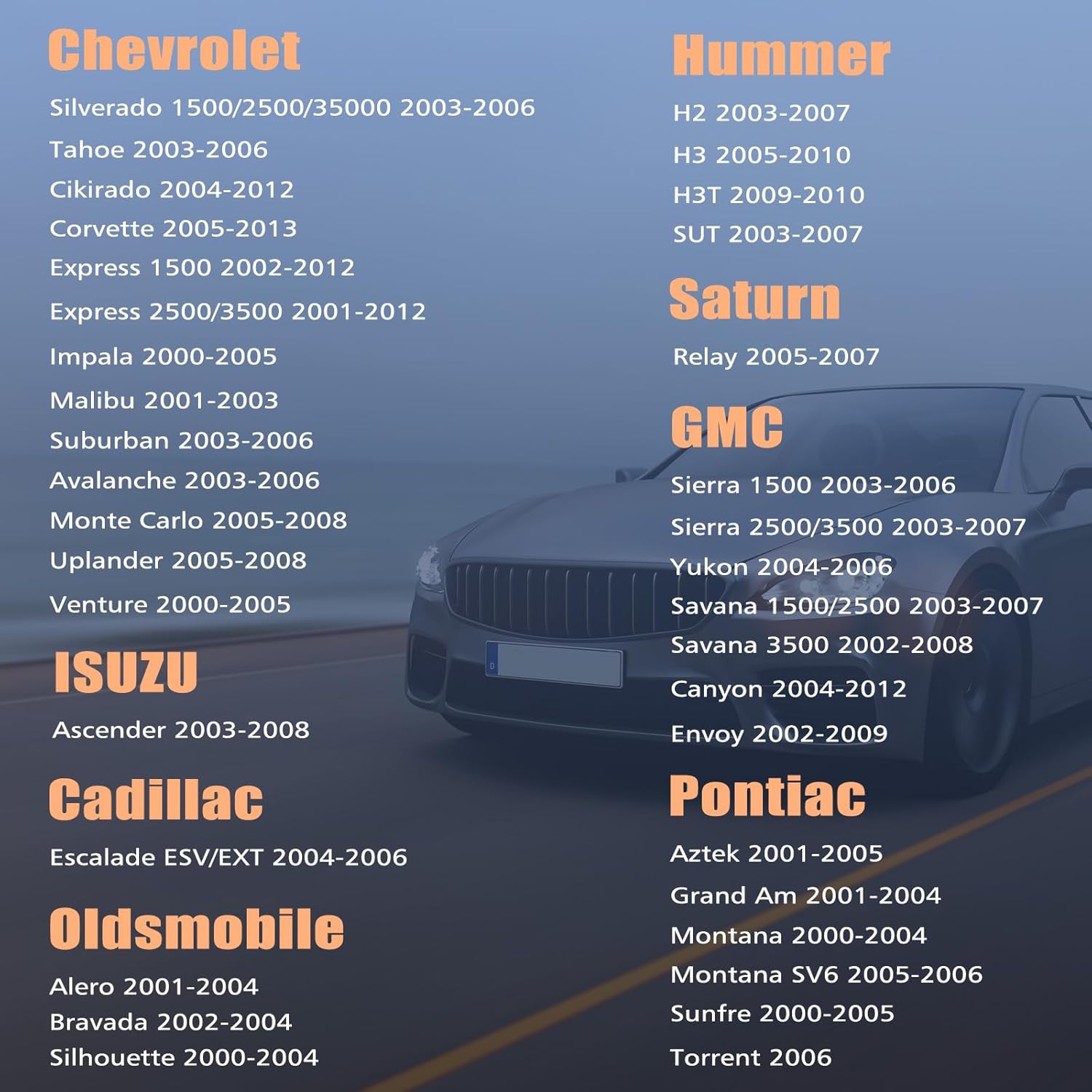 - 【Fits Model 】The Car Radio fits for Chevrolet Chevy Silverado 1500 2500 3500 2003-2006; Tahoe 2003-2006; Colorado 2004-2012; Corvette 2005-2013; Express 1500 2500 3500 2002-2012; Impala 2000-2005; Malibu 2001-2003; Suburban 2003-2006; Avalanche 2003-2006; Sierra 1500 2500 3500 2003-2006; Yukon 2004-2006; Savana 1500 2500 3500 2003-2007; Canyon 2004-2012; Terraza 2005-2007; H2 2003-2007; H3 2005-2010; H3T 2009-2010; SUT 2003-2007; Monte Carlo 2000-2005; Uplander 2005-2008.
