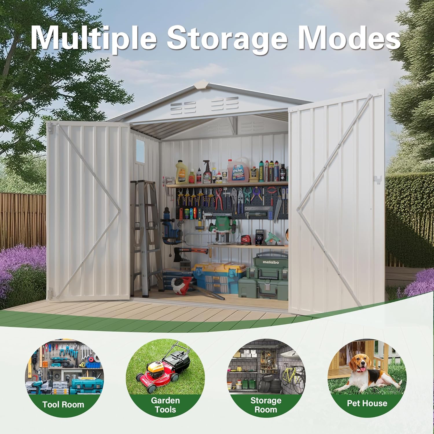 - UNYIELDING ALL-WEATHER PROTECTION: Move beyond plastic cabinets that fade and crack; our metal shed is forged from heavy-duty, pre-painted galvanized steel with multiple anti-rust treatments to stand strong against the elements; The peaked, watertight roof design ensures your equipment stays completely dry and protected, making this waterproof outdoor storage shed a reliable guardian for your valuables year-round