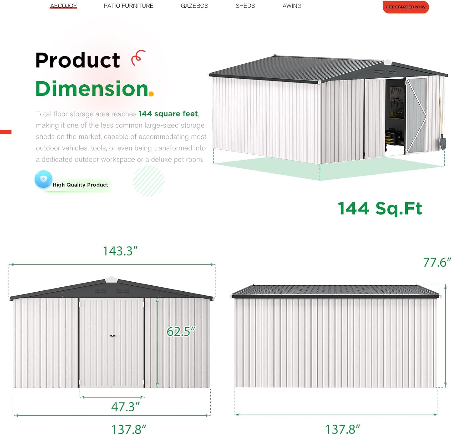 AECOJOY 12' x 12' Outdoor Storage Shed, Large Metal Sheds & Outdoor Storage Clearance Steel Yard Shed with Lockable Doors, Utility and Tool Storage Garden Shed for Backyard, Patio and Outside