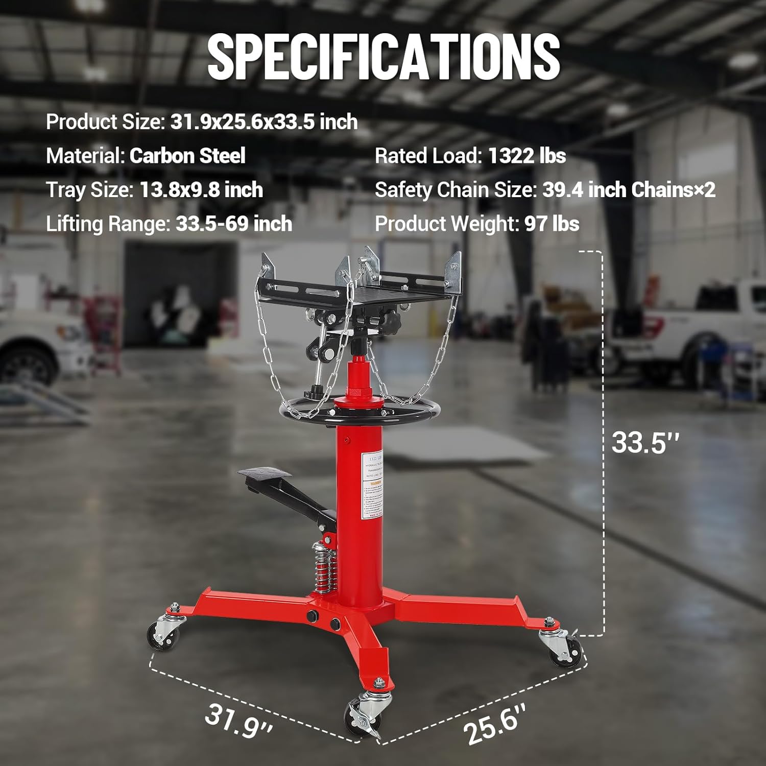 - Industrial-Grade Load Capacity: The hydraulic transmission jack's 2-stage hydraulic ram safely lifts up to 1322 lbs. Reinforced steel frame prevents bending during transmission removal on trucks/SUVs.