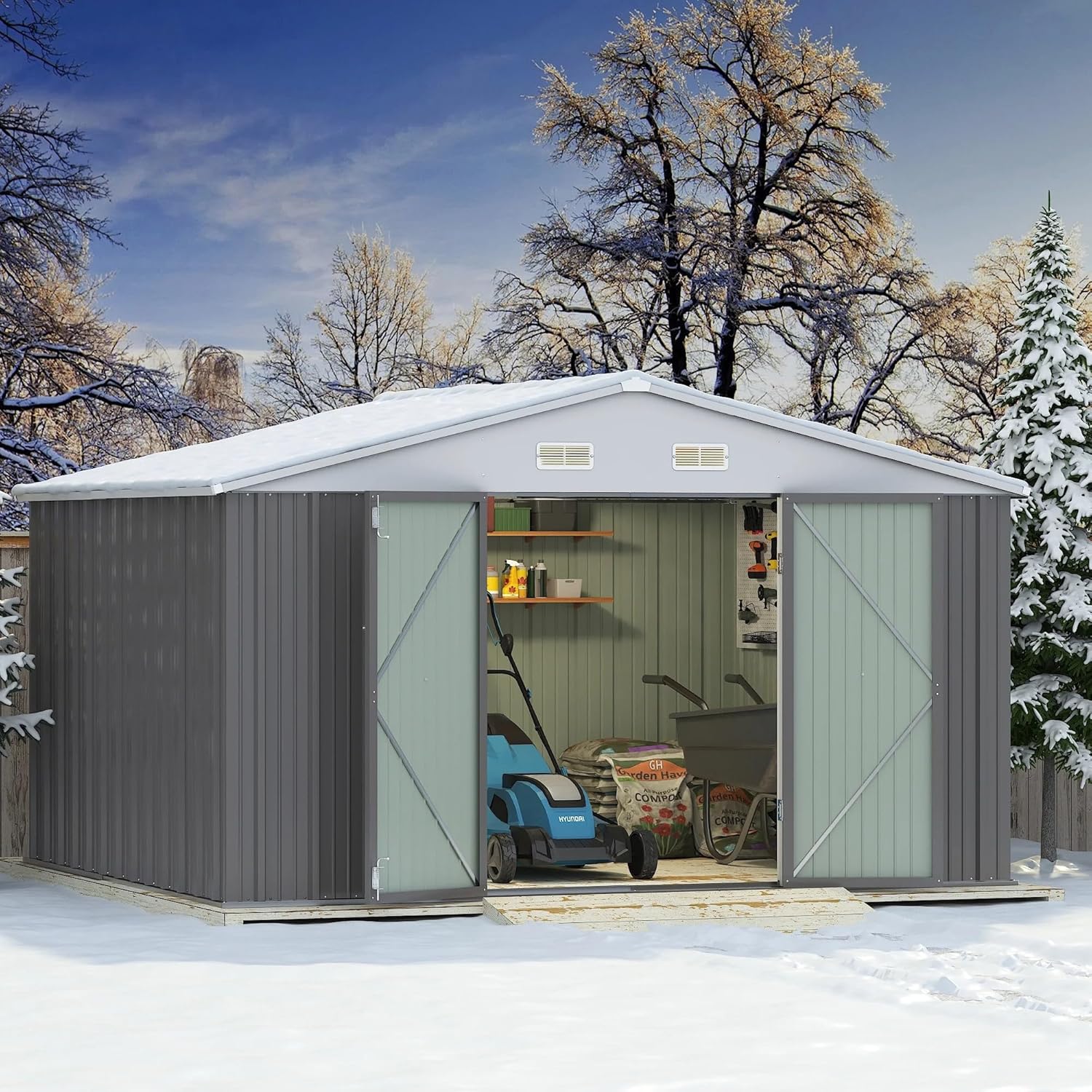 Greesum 10×8FT Outdoor Storage Shed, Metal Patio Storaged Sheds with Lockable Doors, Sheds & Outdoor Storage for Bike, Backyard, Pool and Garden, Gray