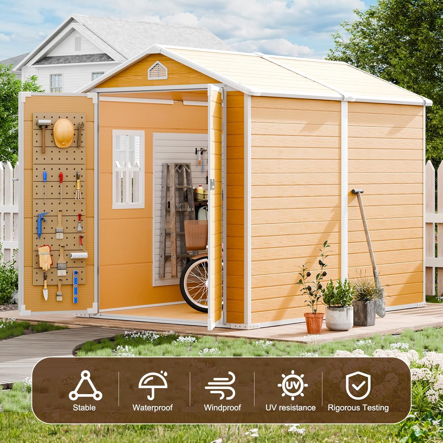 8x6 FT Resin Storage Shed, Waterproof Outdoor Shed w/Floor Included, 2 Windows, Double Lockable Doors & Vents,Outside Plastic Tool Sheds for Garden, Lawn, Backyard, Wood-Grain Brown