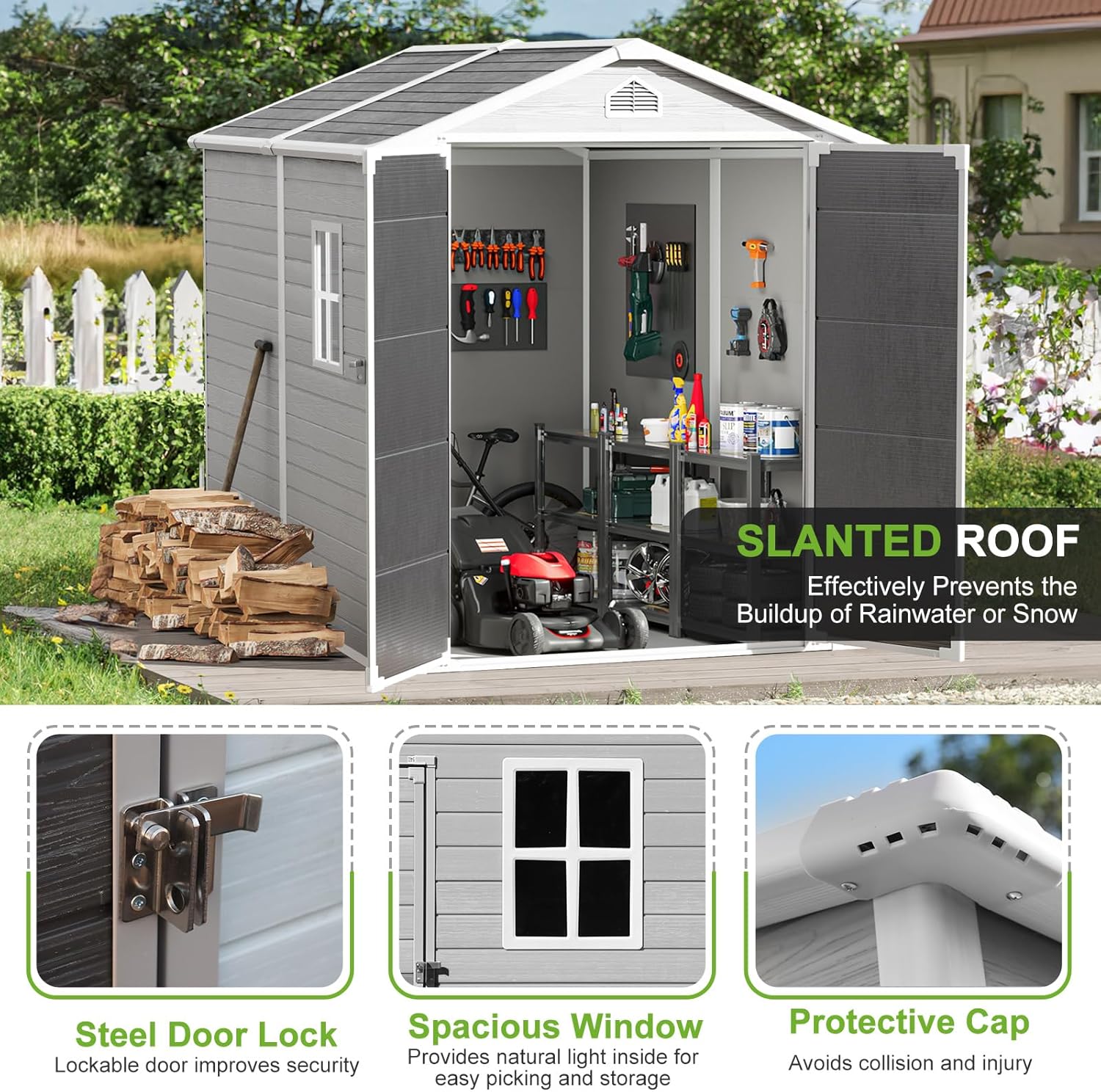 - 🏠SPACIOUS STORAGE SHED: This multi-purpose outdoor storage shed can be used as a utility room,pet house, bike shed, tool shed and large garbage can,and it is perfect for storing your large lawn care essentials such as lawn mowers and more to keep your garden organized.