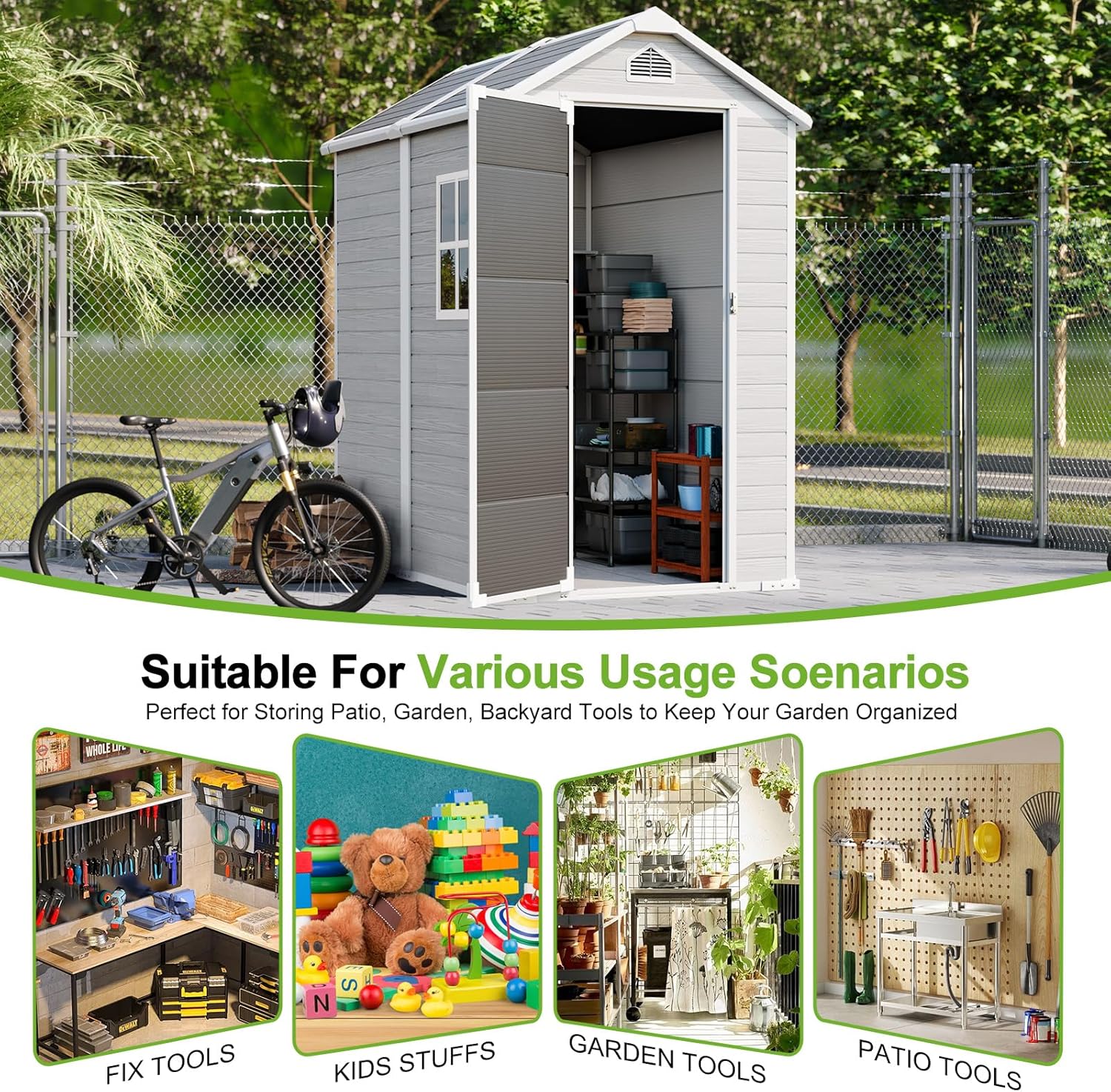 - 🏠SPACIOUS STORAGE SHED: This multi-purpose outdoor storage shed can be used as a utility room,pet house, bike shed, tool shed and large garbage can,and it is perfect for storing your large lawn care essentials such as lawn mowers and more to keep your garden organized.