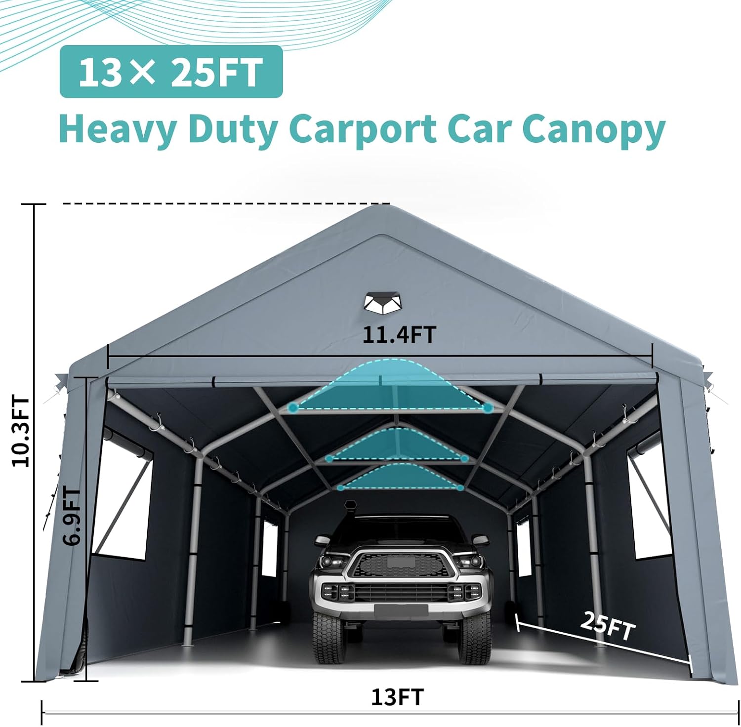 Carports 13X25 Heavy Duty,Car Ports with 180G Removable Side Wall,Portable Car Port Garage,Carport Canopy, Car Shelter All Weather,Grey