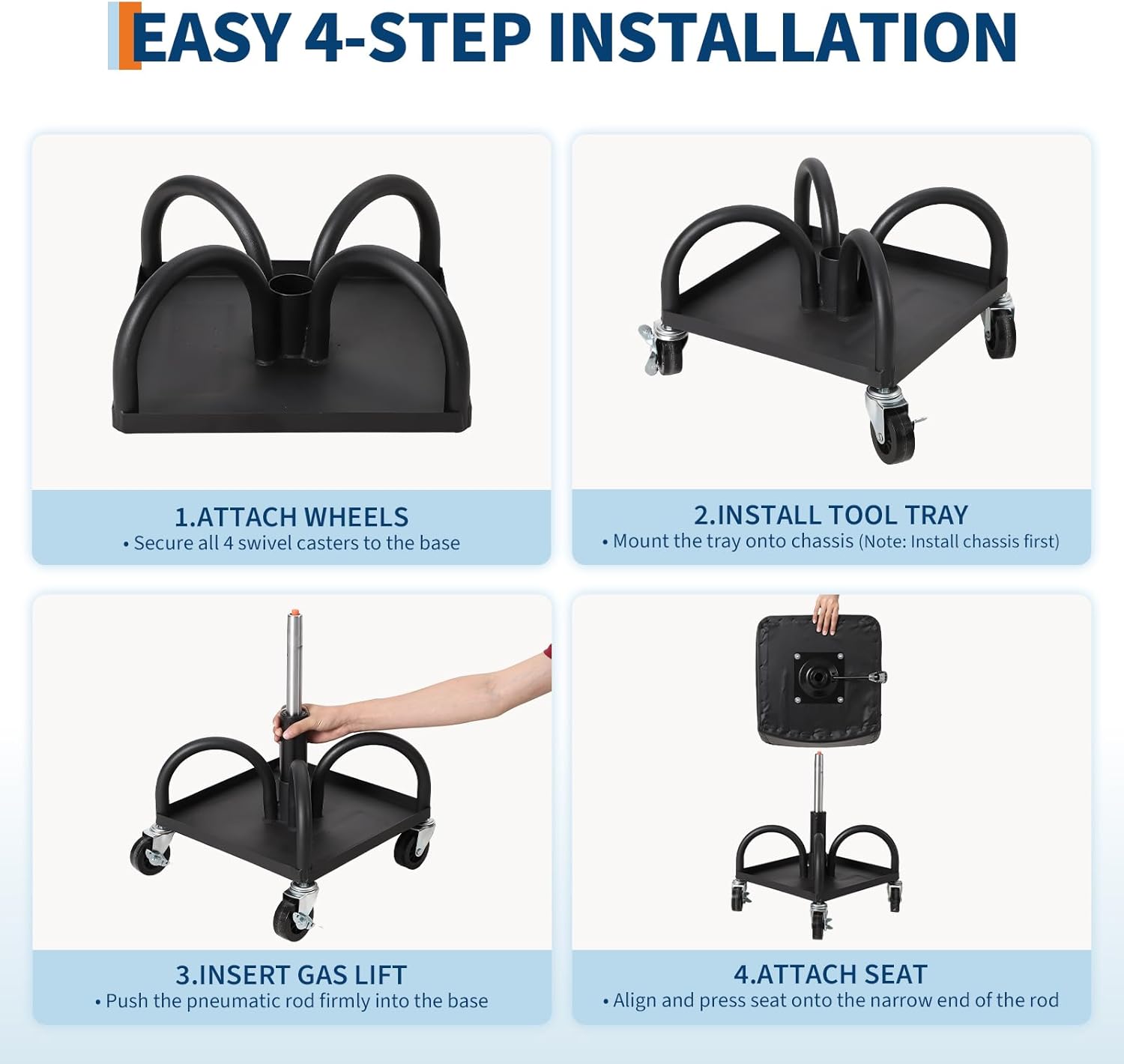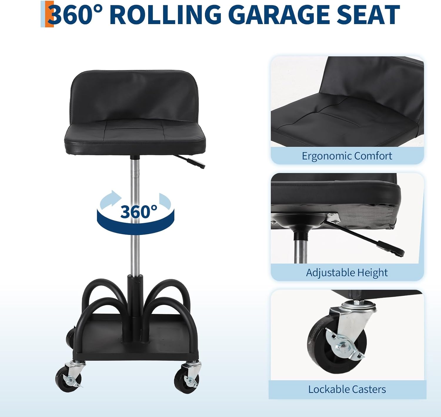 - Versatile Workshop: Perfect for garages, auto detailing, and various workshop tasks, this adjustable rolling stool boosts productivity and reduces unnecessary trips by keeping you comfortable and organized.