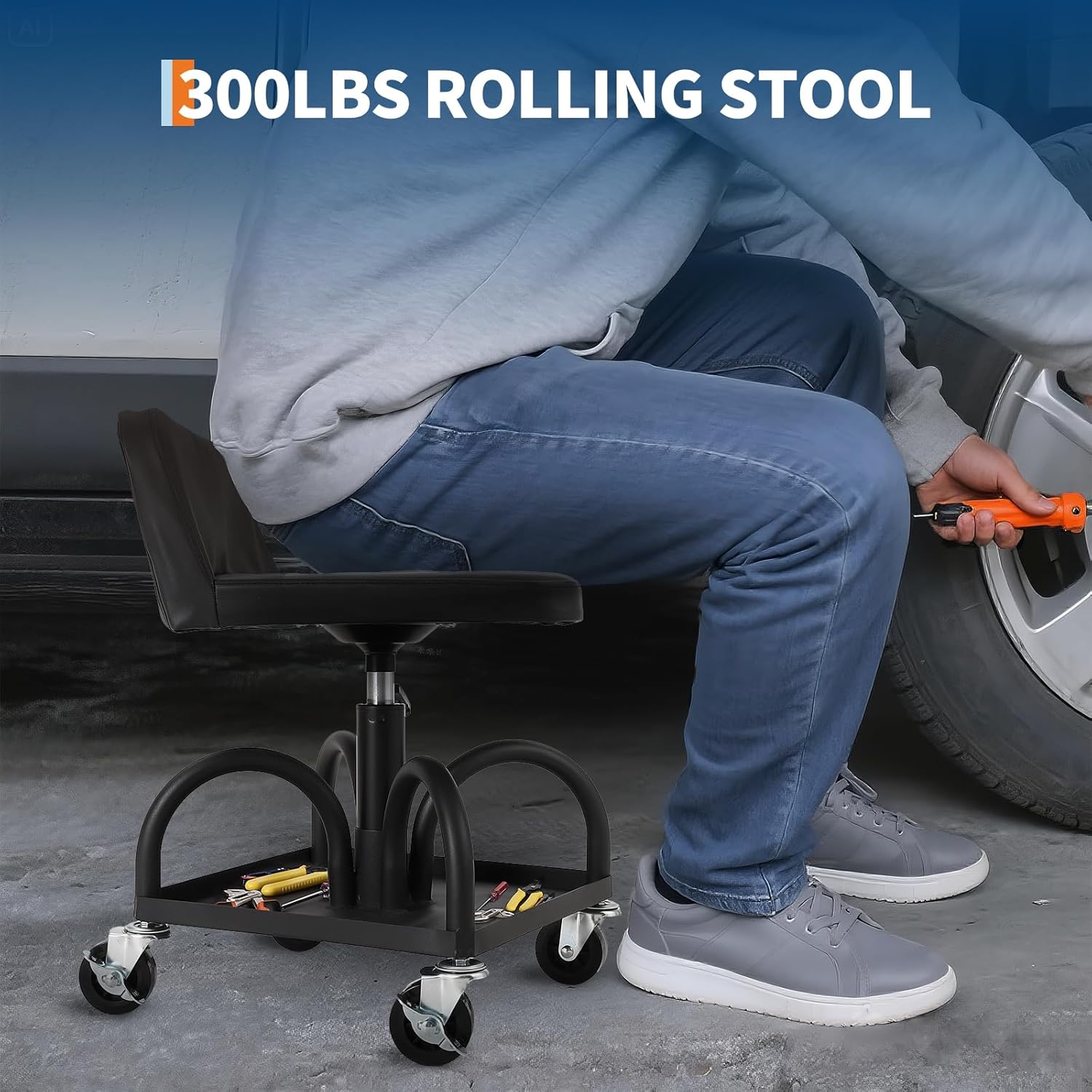 Garage Stool, 19”-25” Adjustable Rolling Mechanic Stool with Universal Wheels, Removable Magnetic Tool Tray, 300LBS Capacity, Roller Creeper Seat, Shop Chair