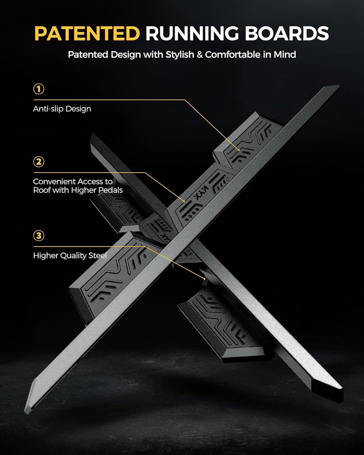 - PATENTED DESIGN: Exclusive design provides an extraordinary appearance for your vehicle and convenience for getting on/off the car with an extra step area and proper ground clearance.