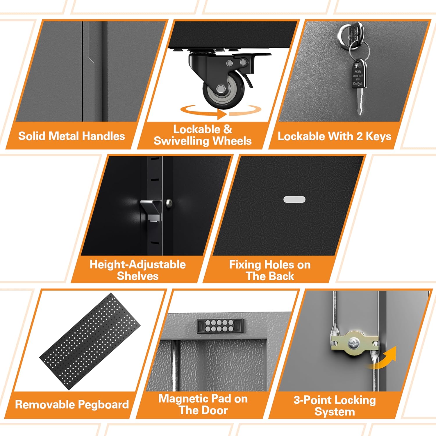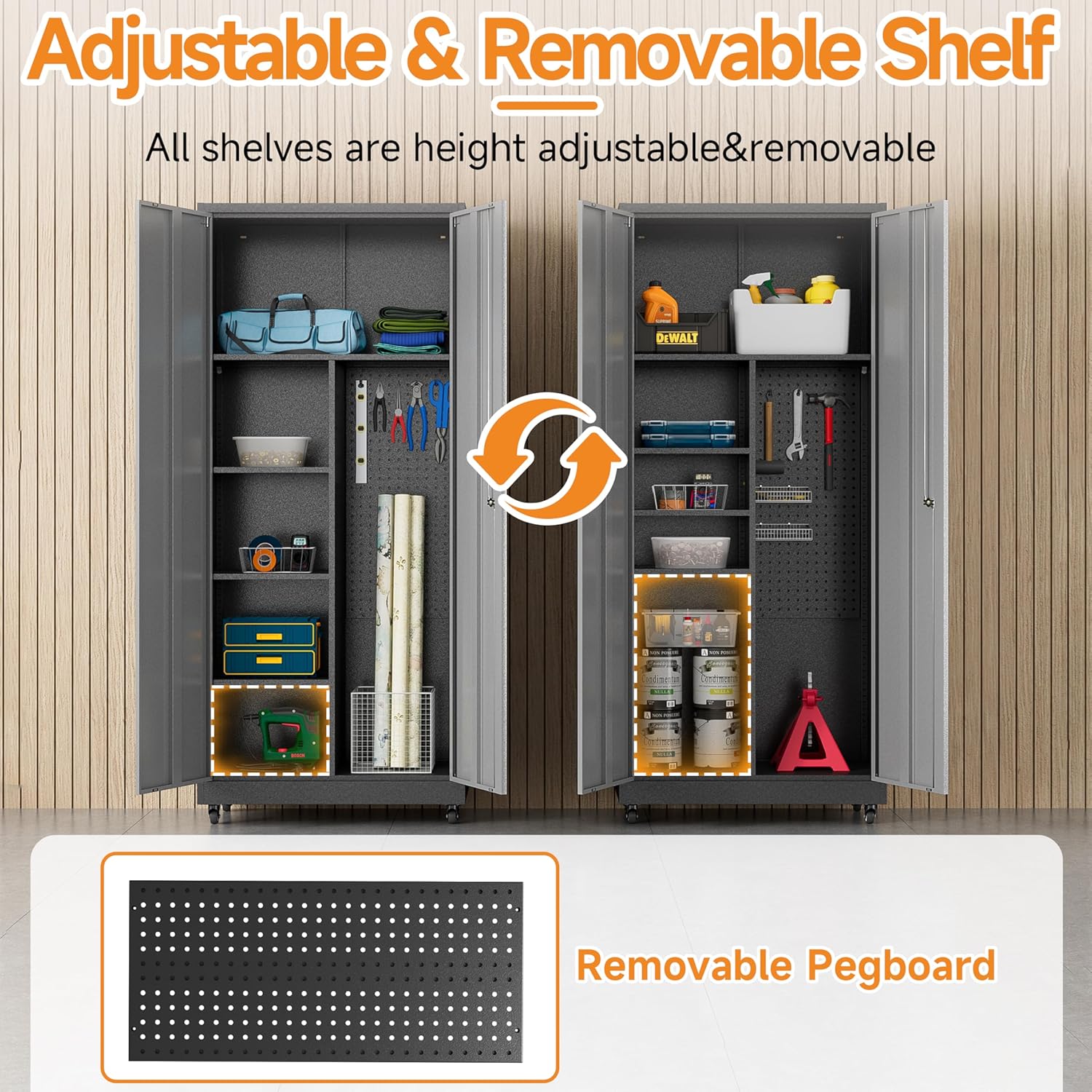 - 🛠️【Ample Storage Space with Customizable Layout】Offering more storage than traditional cabinets, this garage storage cabinet features adjustable and removable shelves to fit tools of any size and a portable pegboard that detaches for on-the-go organization, tailored to your specific needs.