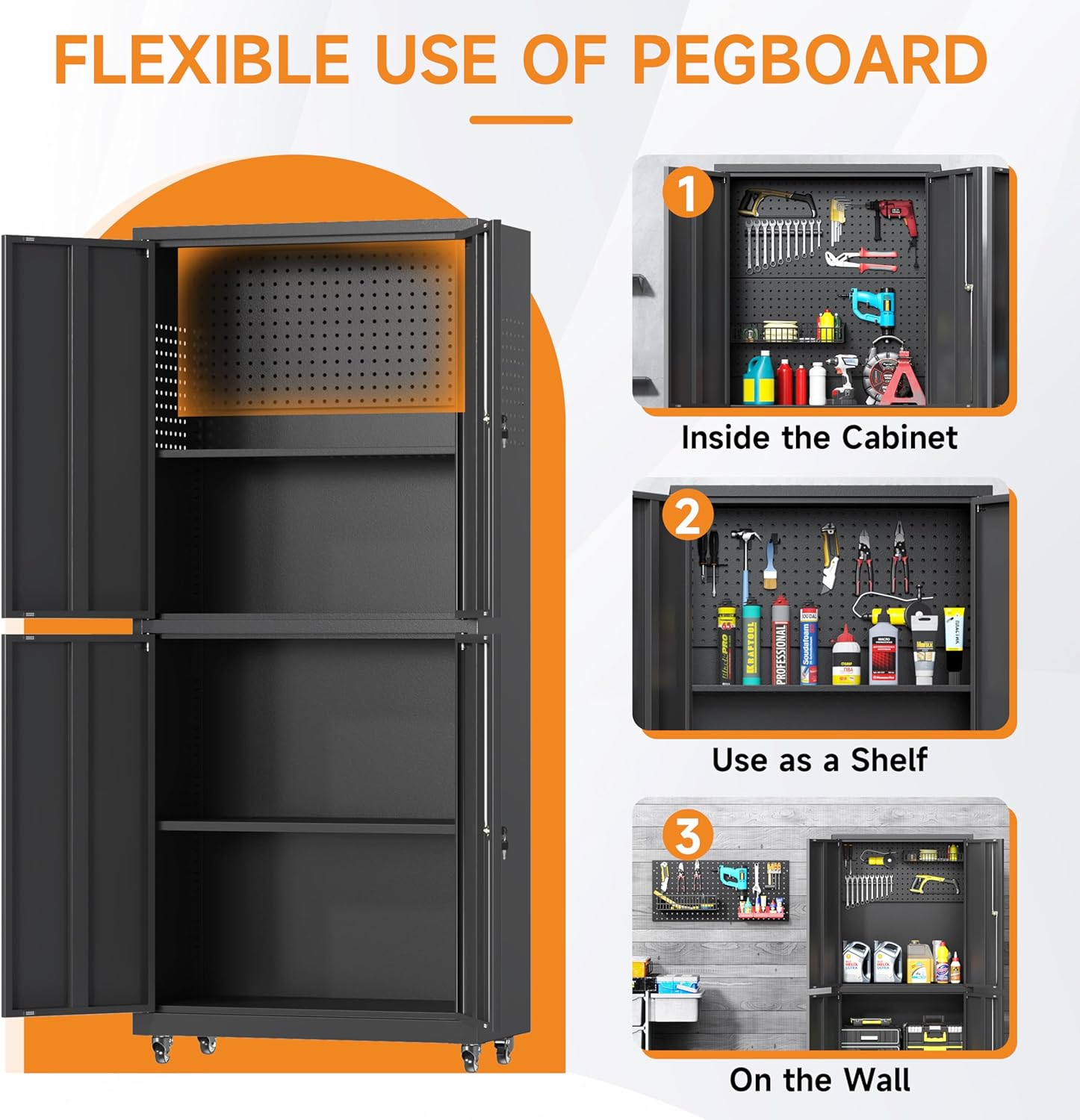 71" H Metal Tool Storage Cabinet with Lock and Wheels, Heavy Duty Garage Cabinet with 4 Doors and 2 Adjustable Shelves, Tool Organizer with Pegboard for Garage, Warehouse(Black, 71" H)