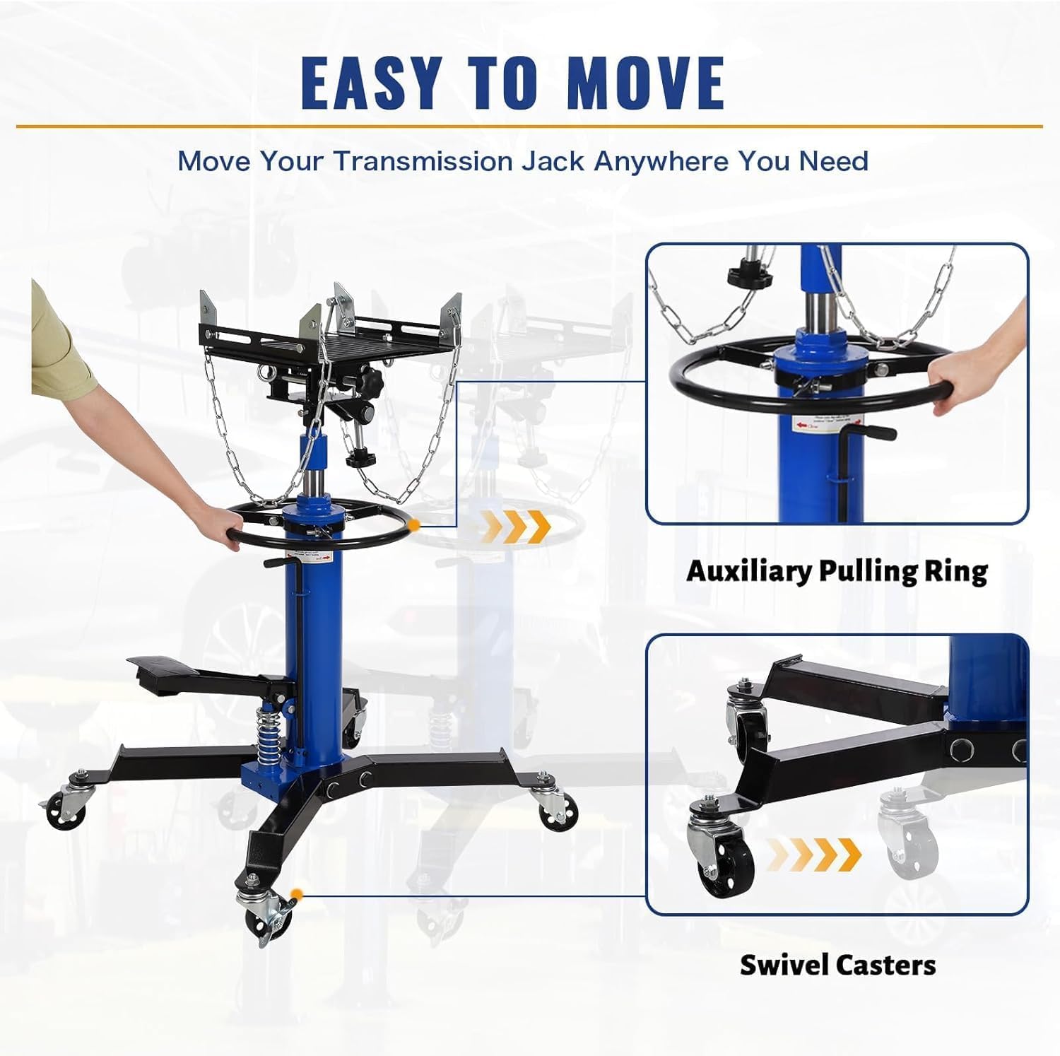 - 360° Swivel Wheels with Brakes for Mobility:Four durable swivel casters—two with locking brakes—offer effortless maneuverability on any garage floor. The ergonomic central pull ring helps you position the jack precisely where needed, and the wheel locks provide firm stability during lifts, making it a highly versatile and safe transmission jack.