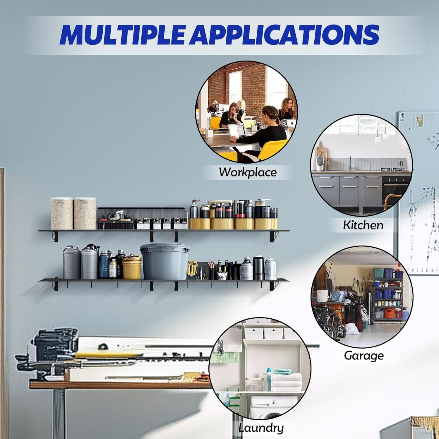 - 【Heavy-duty Garage Wall Organizer】The wall mounted garage shelves are constructed from durable, heavy-duty carbon steel. The high-quality materials and sturdy construction ensure they can safely support up to 1,200 pounds, meeting your storage needs.