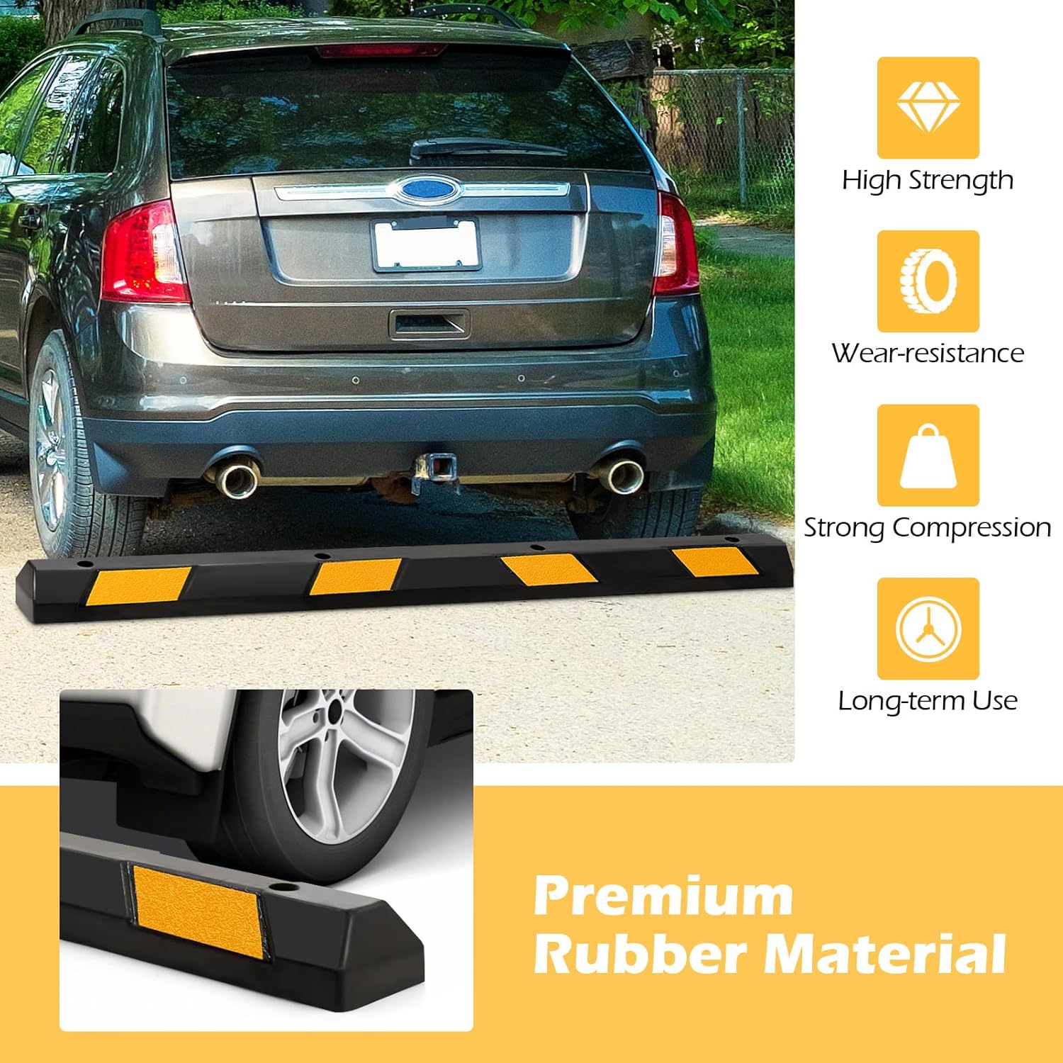 - High-Visibility Reflective Strips: Adorned with eight vivid yellow reflective strips, this car stopper ensures superior visibility for drivers and pedestrians, clearly marking parking boundaries in all weather. Its resilient material resists fading, cracking, and aging for long-lasting reliability.